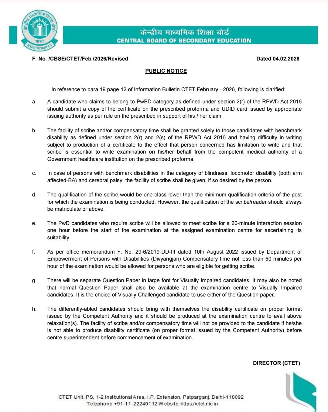 CTET February – 2026 PUBLIC NOTICE In reference to para 19 page 12 of Information Bulletin CTET February – 2026, following is clarified: a. A candidate who claims to belong to PwBD category as defined under section 2(r) of the RPWD Act 2016 should submit a copy of the certificate on the prescribed proforma and … Read more