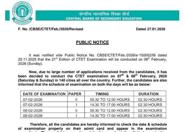 CTET exam PUBLIC NOTICE It was notified vide Public Notice No. CBSE/CTET/Feb./2026/e-150092/IB dated 25.11.2025 that the 21st Edition of CTET Examination will be conducted on 08th February, 2026 (Sunday). Now, due to large number of applications received from the candidates, it has been decided to conduct the CTET examination on 07th & 08th February, 2026 … Read more