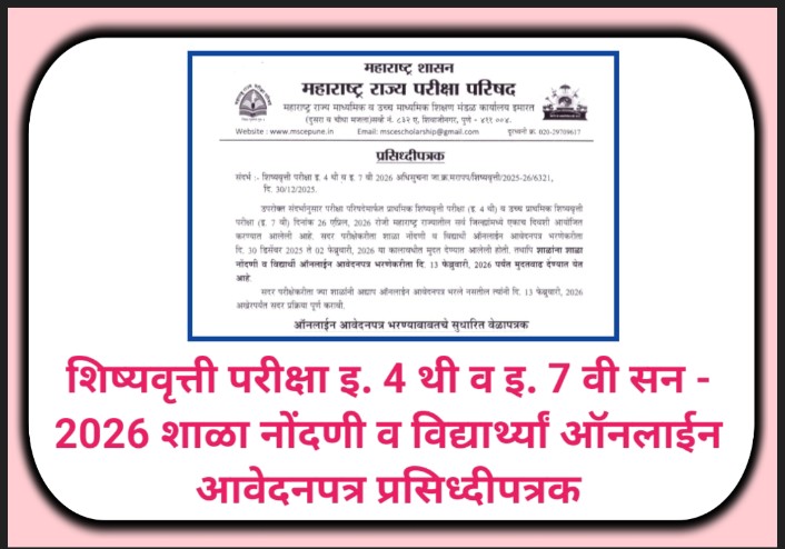 शिष्यवृत्ती परीक्षा इ. 4 थी व इ. 7 वी सन – 2026 शाळा नोंदणी व विद्यार्थ्यां ऑनलाईन आवेदनपत्र प्रसिध्दीपत्रक scolarship exam registration