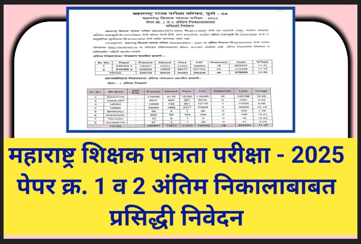 महाराष्ट्र शिक्षक पात्रता परीक्षा – 2025 पेपर क्र. 1 व 2 अंतिम निकालाबाबत प्रसिद्धी निवेदन teacher eligibility test final results