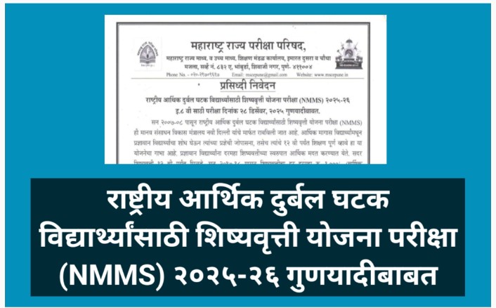 राष्ट्रीय आर्थिक दुर्बल घटक विद्यार्थ्यांसाठी शिष्यवृत्ती योजना परीक्षा (NMMS) २०२५-२६ गुणयादीबाबत nmms scolarship exam  इ.८ वी साठी परीक्षा दिनांक २८ डिसेंबर, २०२५ गुणयादीबाबत. सन २००७-०८ पासून राष्ट्रीय आर्थिक दुर्बल घटक विद्यार्थ्यांसाठी शिष्यवृत्ती योजना परीक्षा (NMMS) ही मानव संसाधन विकास मंत्रालय नवी दिल्ली यांचे मार्फत राबविली जात आहे. आर्थिक मागास विद्यार्थ्यांमधून प्रज्ञावान विद्यार्थ्यांचा शोध घेऊन त्यांच्या … Read more