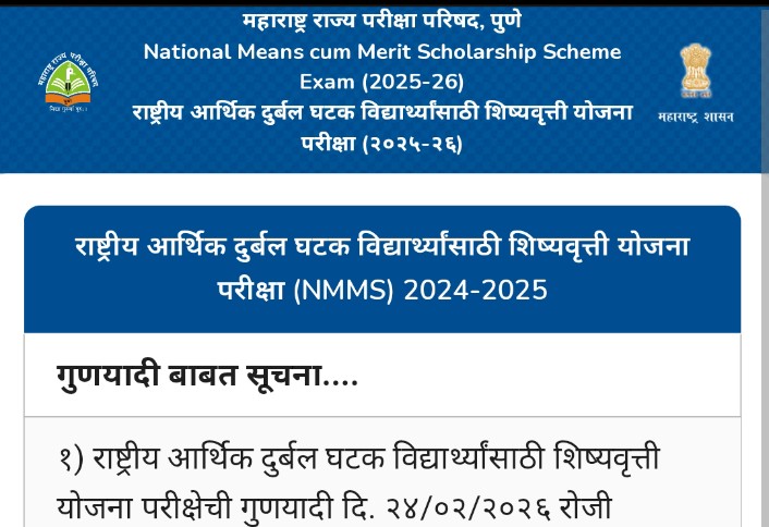 NMMS शिष्यवृत्ती योजना परीक्षा (२०२५-२६) गुणयादी लिंक उपलब्ध nmms exam merit list declared  १) राष्ट्रीय आर्थिक दुर्बल घटक विद्यार्थ्यांसाठी शिष्यवृत्ती योजना परीक्षेची गुणयादी दि. २४/०२/२०२६ रोजी परिषदेच्या https://www.mscepune.in व https://mscenmms.in या संकेतस्थळावर जाहीर करण्यात आली आहे. शासन परिपत्रक pdf download  २) सदर यादीमध्ये विद्यार्थ्यांचे नाव, वडिलांचे नाव, आडनाव, आईचे नाव यामधील स्पेलिंग दुरुस्ती असल्यास (कोणत्याही … Read more