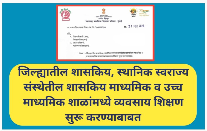 जिल्ह्यातील शासकिय, स्थानिक स्वराज्य संस्थेतील शासकिय माध्यमिक व उच्च माध्यमिक शाळांमध्ये व्यवसाय शिक्षण सुरू करण्याबाबत vyavsay shikshan paripatrak  जिल्ह्यातील शासकिय, स्थानिक स्वराज्य संस्थेतील शासकिय माध्यमिक व उच्च माध्यमिक शाळांमध्ये व्यवसाय शिक्षण सुरू करण्याबाबत महाराष्ट्र प्राथमिक शिक्षण परिषद, मुंबई ने दिः 24 FEB 2026 रोजी पुढील प्रमाणे निर्देश दिले आहे. शालेय शिक्षण व क्रीडा विभाग, मंत्रालय, … Read more