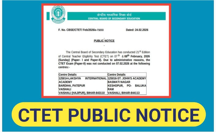 CTET PUBLIC NOTICE The Central Board of Secondary Education has conducted 21st Edition of Central Teacher Eligibility Test (CTET) on 07 th & 08th February, 2026 (Sunday) (Paper- I and Paper-II). Due to administrative reasons, the CTET Exam (Paper-II) was not conducted on 07.02.2026 at the following centres:- The Board has now decided to conduct … Read more