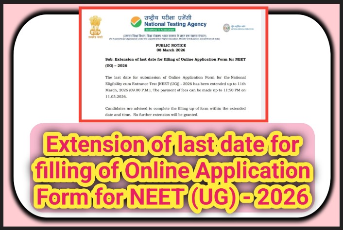 Extension of last date for filling of Online Application Form for NEET (UG) – 2026 The last date for submission of Online Application Form for the National Eligibility cum Entrance Test [NEET (UG)] – 2026 has been extended up to 11th March, 2026 (09.00 P.M.). The payment of fees can be made up to 11:50 … Read more
