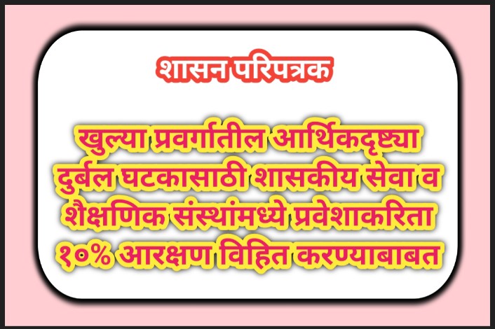 खुल्या प्रवर्गातील आर्थिकदृष्ट्या दुर्बल घटकासाठी शासकीय सेवा व शैक्षणिक संस्थांमध्ये प्रवेशाकरिता १०% आरक्षण विहित करण्याबाबत reservation