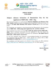 The Candidates may please note that this is NOT the Admit Card for NEET (UG) -2026. This is advance information for the allotment of the City where the Examination Centre will be located, to facilitate the candidates. The Admit Card of NEET (UG)- 2026 shall be issued later.