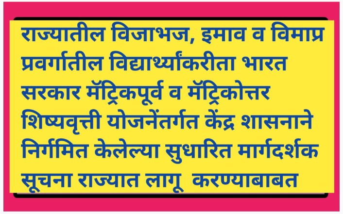 सामाजिक न्याय व अधिकारिता मंत्रालय, भारत सरकार यांनी विजाभज, इमाव व विमाप्र प्रवर्गातील विद्यार्थ्यांसाठी भारत सरकार मॅट्रीकपूर्व व मॅट्रिकोत्तर शिष्यवृत्ती योजनेकरिता सुधारीत मार्गदर्शक सूचना जारी केलेल्या आहेत. त्यानुषंगाने सदर मार्गदर्शक सूचना राज्यात लागू करण्याची बाब शासनाच्या विचाराधिन होती.