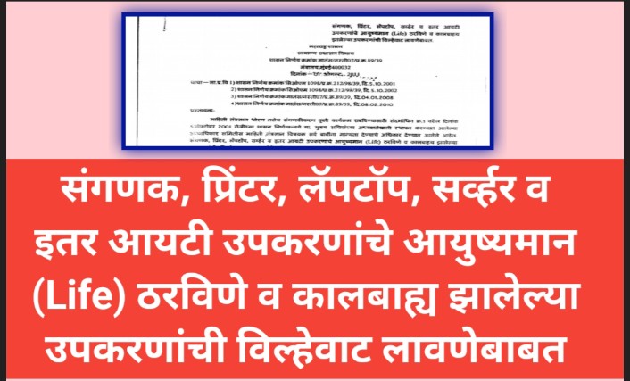 संगणक, प्रिंटर, लॅपटॉप, सव्र्व्हर व इतर आयटी उपकरणांचे आयुष्यमान (Life) ठरविणे व कालबाह्य झालेल्या उपकरणांची विल्हेवाट लावण्याबाबतचे उपरोक्त संदर्भाधिन क्र 3 व 4 है शासन निर्णय अधिक्रमित करून संगणक, लॅपटॉप, प्रिंटर, सव्र्व्हर व इतर सर्व आयटी संबंधित उपकरणांचे वयोमान 5 वर्षे निश्चित करण्यात येत आहे.