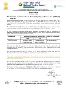 In view of the above, National Testing Agency is pleased to inform you that the opportunity for correcting or modifying errors/details as per Annexure-I in your Online Application Form for NEET (UG)-2026 will be available as mentioned below