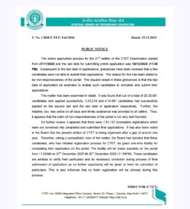 On further review, it appears that there were 1,61,127 incomplete registrations which were not converted into completed and submitted final applications. It has also been noted in the Board that the present edition of CTET is being organized after a gap of around one year. Therefore, taking a sympathetic view of the matter, the Board has decided that these candidates, who had initiated registration process for CTET, be given one-time facility for completing their application on the portal. The facility will be made available on the portal from 11.00AM on 27th December 2025 till 30th December 2025 (11.59PM). These candidates are advised to verify their particulars and do necessary correction during process of final submission of application as no further opportunity will be given to them for correction of particulars. This is also informed that no fresh registration will be allowed during this. process.