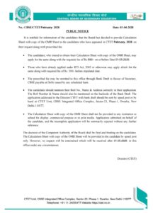 It is notified for information of the candidates that the Board has decided to provide Calculation Sheet with copy of the OMR Sheet to the candidates who have appeared in CTET February, 2026 on their request along with prescribed fee.