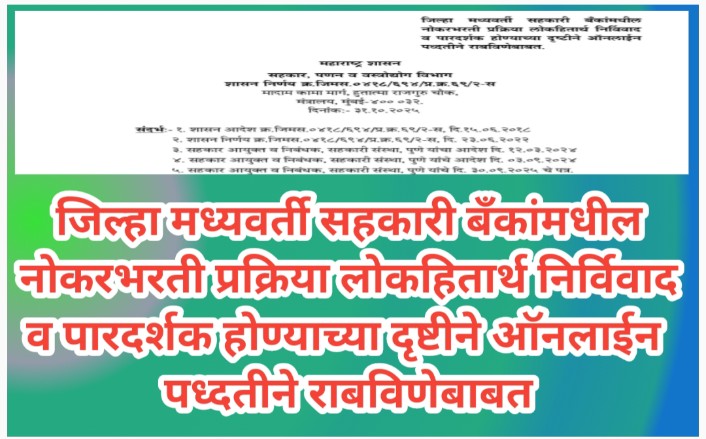 राज्यातील जिल्हा मध्यवर्ती सहकारी बँकांमधील नोकरभरती प्रक्रिया लोकहितार्थ निर्विवाद व पारदर्शक होण्याच्या दृष्टीने ऑनलाईन पध्दतीने राबविण्याबाबत संदर्भ क्र. १ मधील शासन आदेश तसेच संदर्भ क्र.२ मधील शासन निर्णय निर्गमित करण्यात आला आहे.
