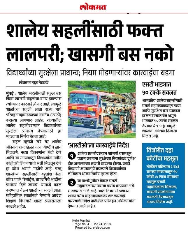 शालेय सहलींसाठी फक्त लालपरी; खासगी बस नको विद्यार्थ्यांच्या सुरक्षेला प्राधान्य; नियम मोडणाऱ्यांवर कारवाईचा बडगा educational trip