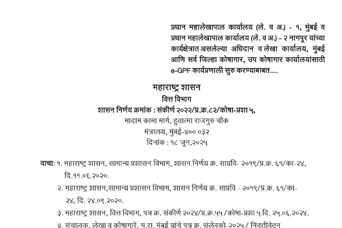 प्रधान महालेखापाल कार्यालय (ले. व अ.) १, मुंबई व प्रधान महालेखापाल कार्यालय (ले. व अ.) २ नागपूर यांच्या कार्यक्षेत्रात असलेल्या अधिदान व लेखा कार्यालय, मुंबई आणि सर्व जिल्हा कोषागार, उप कोषागार कार्यालयांसाठी e-GPF कार्यप्रणाली सुरु करण्याबाबत egpf pranali