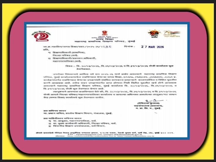 उपरोक्त विषयान्वये आर्थिक वर्ष सन २०२५-२६ मार्च अखेर असल्याने महाराष्ट्र प्राथमिक शिक्षण परिषद, मुंबई कार्यालयामार्फत राबविण्यात येणाऱ्या समग्र शिक्षा, STARS, PMSHRI, JANMAN, JUGA इ. कार्यक्रमांतर्गत राबविण्यात येणाऱ्या उपक्रमांशी संबंधित कामकाज प्राधान्याने कालमर्यादित व विहित मुदतीत करणे आवश्यक आहे. तसेच सदर उपक्रमांतर्गत प्राप्त होणारा निधी विहीत मुदतीत खर्च होणे आवश्यक असल्याने महाराष्ट्र प्राथमिक शिक्षण परिषद, मुंबई कार्यालय दि. २८/०३/२०२६, दि.२९/०३/२०२६ व दि.३१/०३/२०२६ रोजी सुरु ठेवण्यात येणार आहे.