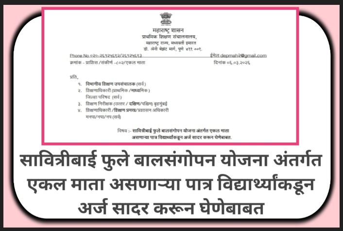 सदर प्रकरणी मा. मुख्यमंत्री यांचे प्रधान सचिव यांच्या अध्यक्षतेखाली दि. १७ फेब्रुवारी, २०२६ रोजी बैठकीत महिला व बालविकास विभागामार्फत राबविण्यात येणा-या क्रांतिज्योती सावित्रीबाई फुले बालसंगोपन योजना अंतर्गत एकल माता असणाऱ्या पात्र विद्यार्थ्यांच्या लाभप्राप्तीबाबत आढावा घेण्यात आला. याबाबत शालेय शिक्षण विभागाने केलेल्या सर्वेक्षणानुसार इ.१ ली ते १२ वीमध्ये शिकणाऱ्या एकल मातांच्या मुलांची संख्या २,२३,०४२ एवढी असल्याने पुढील प्रमाणे निर्देश संदर्भ क्र ४ च्या पत्रान्वये दिलेले आहेत.