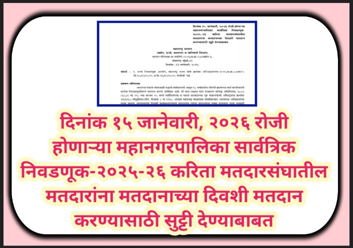 दिनांक १५ जानेवारी, २०२६ रोजी होणाऱ्या महानगरपालिका सार्वत्रिक निवडणूक-२०२५-२६ करिता मतदारसंघातील मतदारांना मतदानाच्या दिवशी मतदान करण्यासाठी सुट्टी देण्याबाबत mahanagarpalika voting