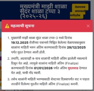 1. मुख्यमंत्री माझी शाळा सुंदर शाळा टप्पा-3 मध्ये दिनांक 19.12.2025 रोजीच्या पत्रान्वये निश्चित केलेल्या वेळापत्रकानुसार शाळांना माहिती भरुन अंतिम करण्यासाठी दिनांक 29/12/2025 पर्यंत मुदत देण्यात आली होती.