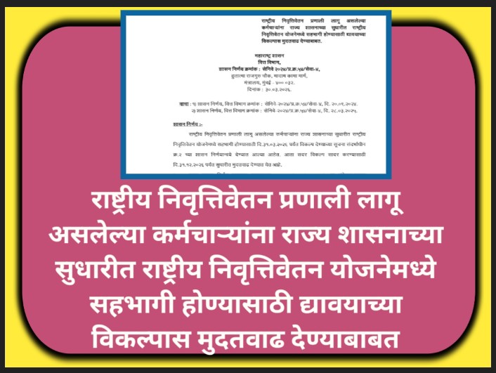 राष्ट्रीय निवृत्तिवेतन प्रणाली लागू असलेल्या कर्मचाऱ्यांना राज्य शासनाच्या सुधारीत राष्ट्रीय निवृत्तिवेतन योजनेमध्ये सहभागी होण्यासाठी दि.३१.०३.२०२६ पर्यंत विकल्प देण्याच्या सूचना संदर्भाधीन क्र.२ च्या शासन निर्णयान्वये देण्यात आल्या आहेत. आता सदर विकल्प सादर करण्यासाठी दि.३१.१२.२०२६ पर्यंत सुधारीत मुदतवाढ देण्यात येत आहे.