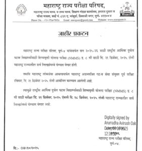 महाराष्ट्र राज्य परीक्षा परिषद, पुणे-४ यांचेमार्फत सन २०२५-२६ साठी राष्ट्रीय आर्थिक दुर्बल घटक विद्यार्थ्यांसाठी शिष्यवृत्ती योजना परीक्षा (NMMS) इ. ८ वी साठी दि. २१ डिसेंबर, २०२५ रोजी महाराष्ट्र राज्यातील सर्व जिल्ह्यांमध्ये घेण्यात येणार होती.