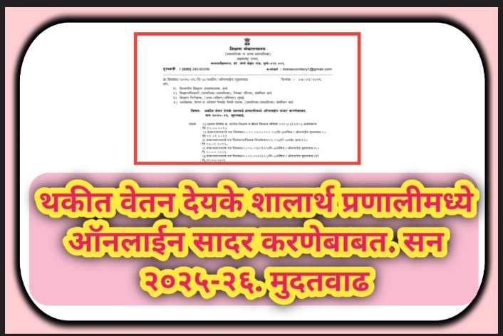 थकीत वेतन देयके शालार्थ प्रणालीमध्ये ऑनलाईन सादर करणेबाबत. सन २०२५-२६. मुदतवाढ online thakit vetan mudatvadh