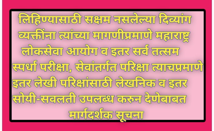 लिहिण्यासाठी सक्षम नसलेल्या दिव्यांग व्यक्तींना त्यांच्या मागणीप्रमाणे महाराष्ट्र लोकसेवा आयोग व इतर सर्व तत्सम स्पर्धा परीक्षा, सेवांतर्गत परिक्षा त्याचप्रमाणे इतर लेखी परिक्षांसाठी लेखनिक व इतर सोयी-सवलती उपलब्ध करुन देणेबाबत मार्गदर्शक सूचना disabilities students competitive exams