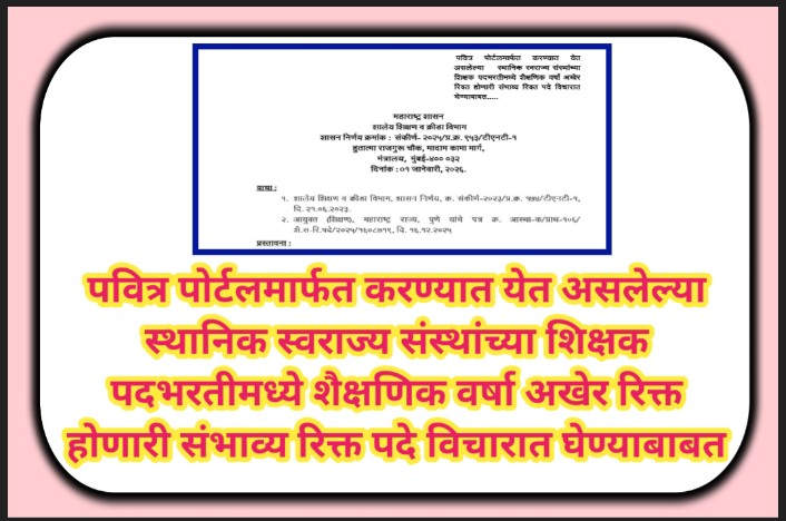 पवित्र पोर्टलमार्फत करण्यात येत असलेल्या स्थानिक स्वराज्य संस्थांच्या शिक्षक पदभरतीमध्ये शैक्षणिक वर्षा अखेर रिक्त होणारी संभाव्य रिक्त पदे विचारात घेण्याबाबत pavitra portal