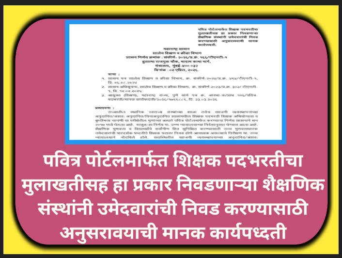 पवित्र पोर्टलमार्फत शिक्षक पदभरतीचा मुलाखतीसह हा प्रकार निवडणाऱ्या शैक्षणिक संस्थांनी उमेदवारांची निवड करण्यासाठी अनुसरावयाची मानक कार्यपध्दती pavitra portal shikshak padabharti