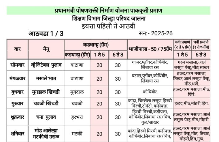 प्रधानमंत्री पोषणशक्ती निर्माण योजना पाककृती प्रमाण इयत्ता पहिली ते आठवी pm poshan mid day meal praman