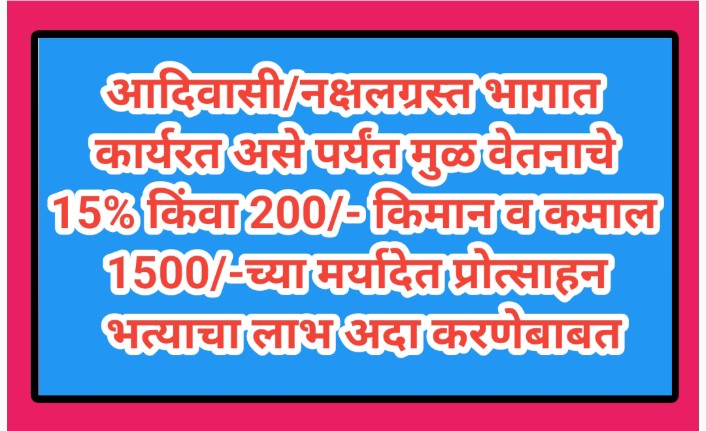 आदिवासी/नक्षलग्रस्त भागात कार्यरत असे पर्यंत मुळ वेतनाचे 15% किंवा 200/- किमान व कमाल 1500/-च्या मर्यादेत प्रोत्साहन भत्याचा लाभ अदा करणेबाबत protsahan bhatta labha ada karnebabat