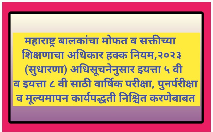 महाराष्ट्र बालकांचा मोफत व सक्तीच्या शिक्षणाचा अधिकार हक्क नियम, २०२३ (सुधारणा) अधिसूचनेनुसार इयत्ता ५ वी व इयत्ता ८ वी साठी वार्षिक परीक्षा, पुनर्परीक्षा व मूल्यमापन कार्यपद्धती निश्चित करणेबाबत punarpariksha pachvi athavi mulyamapan karyapaddhati