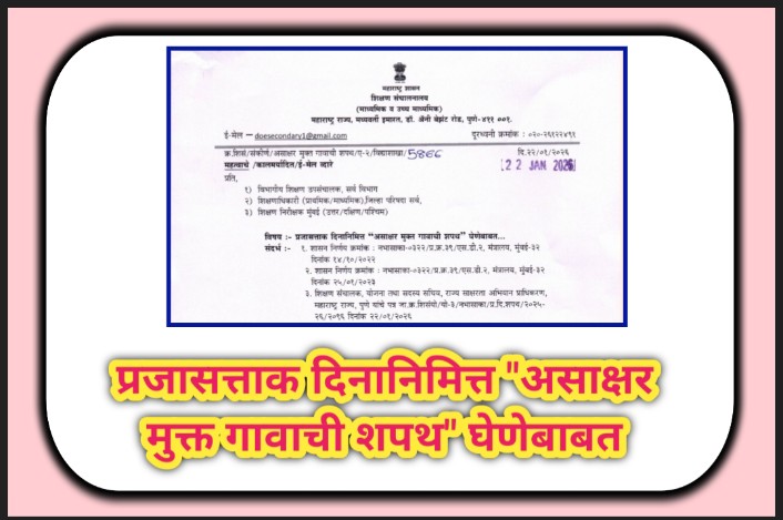 तरी सदर “असाक्षर मुक्त गावाची शपथ” प्रत्येक विद्यार्थ्याने घेण्याबाबत आपण आपल्या अधिनस्त यंत्रणेस आदेशित करावे. सदर उपक्रमाबाबत वर्तमानपत्रे व सोशल मिडीया यांच्या माध्यमातून व्यापक प्रमाणात मोफत प्रसिध्दी देण्यात यावी. असे संदर्भ क्रमांक ३ च्या योजना संचालनालयाच्या पत्राव्दारे कळविण्यात आलेले आहे. (सोबत संदर्भ क्रमांक ३ चे पत्र व “असाक्षर मुक्त गावाची शपथ” / साक्षरता शपथेचा नमुना जोडला आहे.)