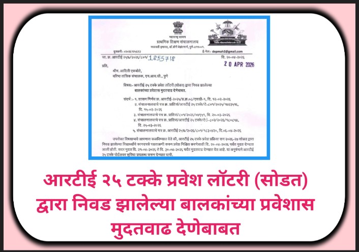 उपरोक्त विषयान्वये आपणास कळविण्यात येते की, आरटीई २५ टक्के प्रवेश प्रक्रिया सन २०२६-२७ सोडत द्वारा निवड झालेल्या विद्यार्थ्यांचे कागदपत्रे पडताळणी करुन प्रवेश निश्चित करणेसाठी दि. २०-०४-२०२६ पर्यंत मुदत देण्यात आली होती. सदर मुदत दि. २१-०४-२०२६ ते दि. ३०-०४-२०२६ पर्यंत मुदतवाढ देण्यात येत आहे. या अनुषंगाने आरटीई २५ टक्के पोर्टलवर सुविधा उपलब्ध करुन देण्यात यावी.