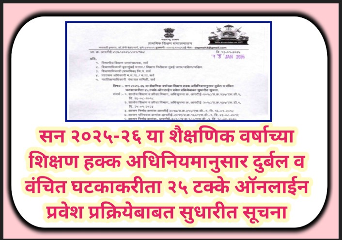 सन २०२५-२६ या शैक्षणिक वर्षाच्या शिक्षण हक्क अधिनियमानुसार दुर्बल व वंचित घटकाकरीता २५ टक्के ऑनलाईन प्रवेश प्रक्रियेबाबत सुधारीत सूचना rte online pravesh