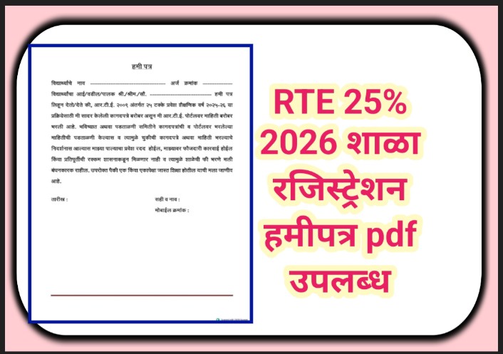 RTE 25% 2026 शाळा रजिस्ट्रेशन हमीपत्र pdf उपलब्ध rte self declaration January 15, 2026 by Spardha Pariksha WhatsApp Group Join Now Telegram Group Join Now RTE 25% 2026 शाळा रजिस्ट्रेशन हमीपत्र pdf उपलब्ध rte self declaration RTE 25% 2026 शाळा रजिस्ट्रेशन हमीपत्र pdf उपलब्ध pdf download Related posts:स्थानिक स्वराज्य संस्थांच्या उच्च प्राथमिक शाळांमधील अंशकालीन निदेशकांच्या मानधनासाठी राज्य हिस्स्या...महाराष्ट्र राज्य माध्यमिक शालांत व उच्च माध्यमिक प्रमाणपत्र परीक्षेच्या प्रभावी अंमलबजावणीसाठी "राज्...TET महाराष्ट्र शिक्षक पात्रता परीक्षा - २०२५ अंतरिम निकालाबाबत teacher eligibility test खाजगी अनुदानित शाळांच्या, शाळा स्तरावरील विविध समित्यांचे एकत्रिकरण करणेबाबत shala stravaril samiti ...मुख्यमंत्री माझी शाळा, सुंदर शाळा टप्पा-३" अभियान (सन २०२५-२६) शाळा मुल्यांकन वेळापत्रक mazi shala s...PAT पायाभूत संकलित मूल्यमापन चाचणी प्रथम सत्र | शिक्षक मार्गदर्शिका, प्रश्नपत्रिका व उत्तरपत्रिका मू...क्रांतीज्योती सावित्रीबाई फुले जयंतीनिमित्त मराठी चारोळ्या krantijoti savitribai fule jayanti १५० दिवसांचा कृती कार्यक्रमांतर्गत E-office ची प्रभावी अंमलबजावणी करण्याबाबत e-office shasan paripat...राष्ट्रीय निवृत्तीवेतन प्रणाली लागू असलेल्या कर्मचाऱ्यांना राज्य शासनाची "सुधारीत राष्ट्रीय निवृत्ती...शासकीय रेखाकला (एलिमेंटरी व इंटरमिजिएट ड्रॉईंग ग्रेड) परीक्षा-२०२५ ड्रॉईंग ग्रेड परीक्षा वेळापत्रक प...