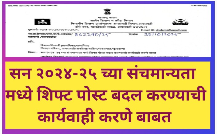 सन २०२४-२५ च्या संचमान्यता मध्ये शिफ्ट पोस्ट बदल करण्याची कार्यवाही करणे बाबत sanchamanyata