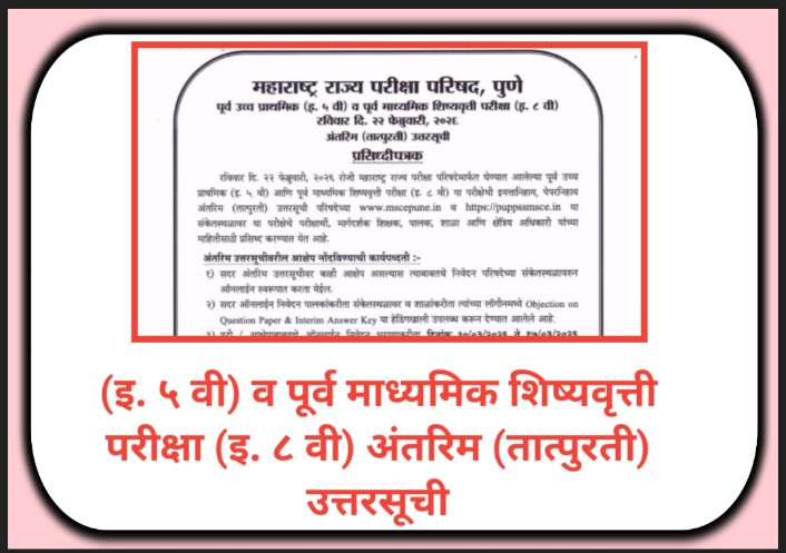 रविवार दि. २२ फेब्रुवारी, २०२६ रोजी महाराष्ट्र राज्य परीक्षा परिषदेमार्फत घेण्यात आलेल्या पूर्व उच्च प्राथमिक (इ. ५ वी) आणि पूर्व माध्यमिक शिष्यवृत्ती परीक्षा (इ. ८ वी) या परीक्षेची इयत्तानिहाय, पेपरनिहाय अंतरिम (तात्पुरती) उत्तरसूची परिषदेच्या www.mscepune.in व https://puppssmsce.in या संकेतस्थळावर या परीक्षेचे परीक्षार्थी, मार्गदर्शक शिक्षक, पालक, शाळा आणि क्षेत्रिय अधिकारी यांच्या माहितीसाठी प्रसिध्द करण्यात येत आहे.