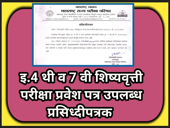 प्राथमिक शिष्यवृत्ती परीक्षा (इ. 4 थी) व उच्च प्राथमिक शिष्यवृत्ती परीक्षा (इ. 7 वी) ही दि. 26/04/2026 रोजी राज्यातील सर्व जिल्ह्यांमध्ये एकाच दिवशी घेण्यात येणार आहे.