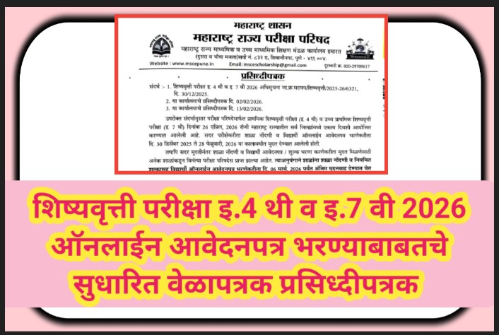 शिष्यवृत्ती परीक्षा इ.4 थी व इ.7 वी 2026 ऑनलाईन आवेदनपत्र भरण्याबाबतचे सुधारित वेळापत्रक प्रसिध्दीपत्रक scolarship exam online application
