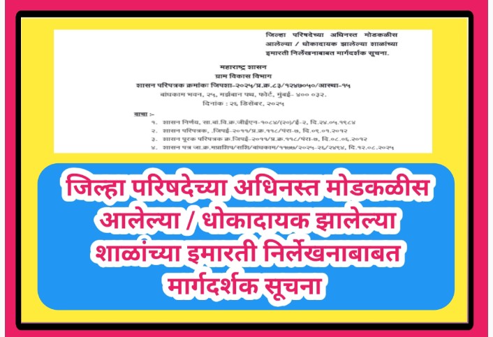 जिल्हा परिषदेच्या अधिनस्त मोडकळीस आलेल्या / धोकादायक झालेल्या शाळांच्या इमारती निर्लेखनाबाबत मार्गदर्शक सूचना shala nirlekhan paripatrak