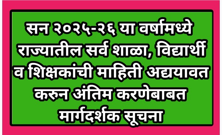 सन २०२५-२६ या वर्षामध्ये राज्यातील सर्व शाळा, विद्यार्थी व शिक्षकांची माहिती दि.३०/०९/२०२५ पर्यंत अद्ययावत करुन अंतिम करणेबाबत मार्गदर्शक सूचना shaley mahiti update