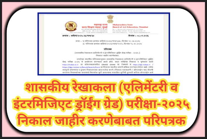 शासकीय रेखाकला (एलिमेंटरी व इंटरमिजिएट ड्रॉईंग ग्रेड) परीक्षा-२०२५ निकाल जाहीर करणेबाबत परिपत्रक shaskiy rekhakala paripatrak