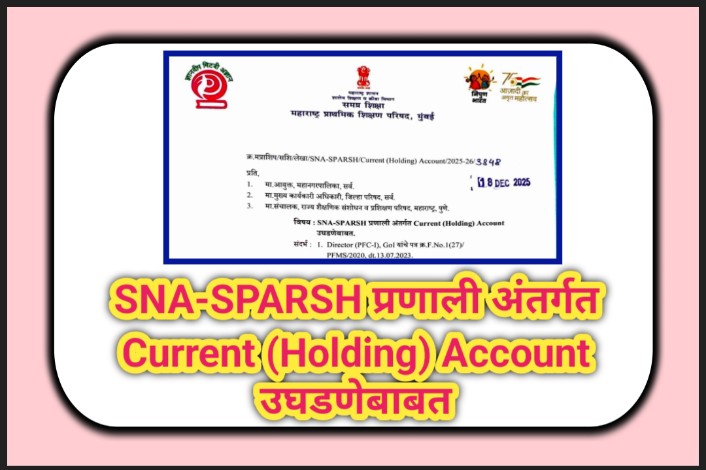 संदर्भ क्र.4 अन्वये आपणास यापूर्वी कळविण्यात आले होते. तरी यानुसार आपणास पुनश्च कळविण्यात येते की, समग्र शिक्षा (SAMAGRA), STARS, PM SHRI, PM JANMAN व इतर केंद्र पुरस्कृत योजनांतर्गत SNA-SPARSH प्रणालीच्या अंमलबजावणीकरिता आपल्या अधिपत्याखालील सर्व अंमलबजावणी यंत्रणा (Implementing Agencies) म्हणजेच जिल्हा परिषद, महानगरपालिका, BRC, DIET, URC, CRC, SMC, KGBV, नेताजी सुभाष आवासी विद्यालय इ. करिता भारत सरकारच्या दि.11.10.2023 च्या मार्गदर्शक सूचना आणि वित्त विभाग, महाराष्ट्र शासन यांच्या दि.30.07.2025 च्या शासन निर्णयातील तरतुदीनुसार कोणत्याही Nationalized/Schedule Commercial बँकेत Current (Holding) Account उघडण्याबाबतची कार्यवाही त्वरित पूर्ण करण्याबाबत आपल्या स्तरावरून संबंधितांना निर्देश व्हावेत, ही विनंती.