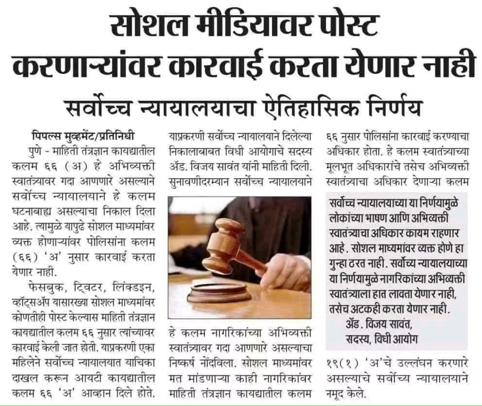 पुणे – माहिती तंत्रज्ञान कायद्यातील कलम ६६ (अ) हे अभिव्यक्ती स्वातंत्र्यावर गदा आणणारे असल्याने सर्वोच्च न्यायालयाने हे कलम घटनाबाह्य असल्याचा निकाल दिला आहे. त्यामुळे यापुढे सोशल माध्यमांवर व्यक्त होणाऱ्यांवर पोलिसांना कलम (६६) ‘अ’ नुसार कारवाई करता येणार नाही.