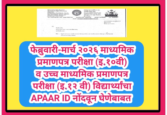 फेब्रुवारी-मार्च २०२६ माध्यमिक प्रमाणपत्र परीक्षा (इ.१०वी) व उच्च माध्यमिक प्रमाणपत्र परीक्षा (इ.१२ वी) विद्यार्थ्यांचा APAAR ID नोंदवून घेणेबाबत ssc hsc apaar id