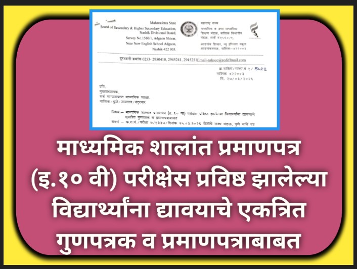 उपरोक्त संदर्भिय विषयाच्या अनुषंगाने आपणास कळविण्यात येते की, राज्य मंडळ, पुणे यांच्या दिनांक १२.०२.२०२६ रोजीच्या कार्यकारी परिषद ठराव कमांक १४४ नुसार फेब्रु/मार्च २०२६ परीक्षेपासून माध्यमिक शालांत प्रमाणपत्र (इ. १० वी) परीक्षेस प्रविष्ठ विद्यार्थ्यांना गुणपत्रक व प्रमाणपत्र स्वतंत्र न देता ती ‘एकत्रित’ (Consolidated) देण्यात येणार आहे. तसेच एकत्रित गुणपत्रक व प्रमाणपत्रावर विद्यार्थ्यांचे नाव First Name. Father Name व Surname या कमाने छपाई करण्यात येणार आहे. सदर कमाच्या अनुषंगाने कोणत्याही विद्यार्थ्यांच्या नावात First Name, Father Name व Surname त्रुटी उदभवणार असल्यास त्याबाबतची दुरूस्ती आपल्या स्तरावर न झाल्यास मंडळामार्फत तातडीने करून घेण्यात यावी.