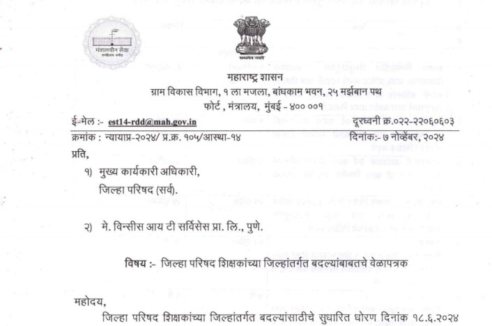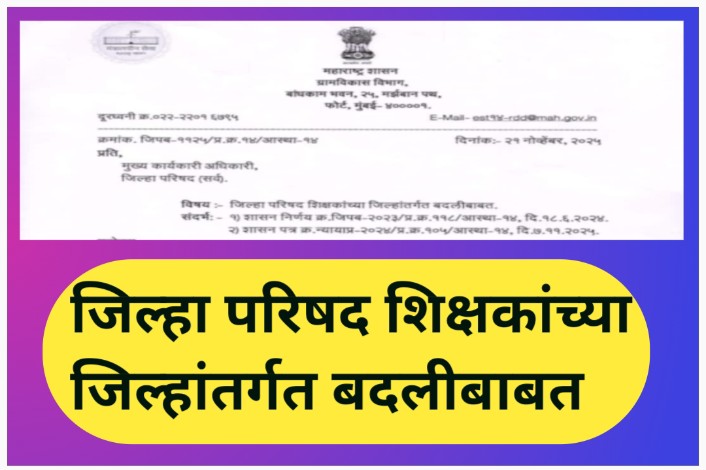 जिल्हा परिषद शिक्षकांच्या जिल्हांतर्गत बदलीबाबतचे वेळापत्रक व इतर सूचना teacher transfer timetable संदर्भ: १) शासन निर्णय क्र. जिपब-२०२३/प्र.क्र.११८/आस्था-१४, दि.१८.६.२०२४. शासन पत्र क्र. न्यायाप्र-२०२४/प्र.क्र.१०५/आस्था-१४, दि.७.११.२०२५. २) ३) मा. उच्च न्यायालय, मुंबई यांनी रिट याचिका क्र. १२१४०/२०२५ आणि अन्य संलग्न याचिकांवर दि.२३.९.२०२३ रोजी दिलेला न्याय-निर्णय. महोदय, जिल्हा परिषद प्राथमिक शिक्षकांच्या जिल्हांतर्गत बदलीबाबतचे धोरण संदर्भ क्र. १ येथील … Read more