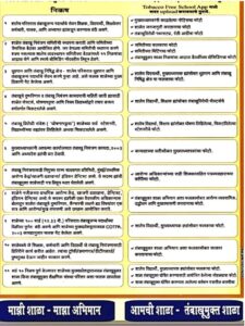 | ३. धूम्रपान आणि तंबाखू निषिद्ध क्षेत्र शालेय परिसरात धूम्रपान आणि तंबाखूजन्य पदार्थाचे सेवन करणे गुन्हा आहे. असे फलक शाळेच्या मुख्य ठिकाणी पेंट केलेला असणे. | ⏭️शालेय विदयार्थी, मुख्याध्यापक ह्यांसोबत धूम्रपान आणि तंबाखू निषिद्ध क्षेत्र या फलकाचा फोटो. |
