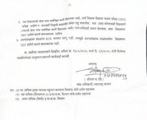 २. जे सेवेत असलेले शिक्षक RTE कायदा लागू होण्यापूर्वी भरती झालेले आहेत आणि ज्यांना निवृत्तीपर्यंत पाच वर्षांपेक्षा जास्त सेवा उरलेली आहे, त्यांच्यासाठी दोन वर्षांच्या आत शिक्षक पात्रता परिक्षा (TET) उत्तीर्ण करणे बंधनकारक राहील. विहित मुदतीत शिक्षक पात्रता परिक्षा (TET) उत्तीर्ण न केल्यास, त्यांच्या सेवा तात्काळ संपुष्टात येतील. अशा कर्मचाऱ्यांना सक्तीने निवृत्त केले जाईल आणि जेवढे हक्काचे निवृत्तीपश्चात लाभ आहेत ते दिले जातील. मात्र, निवृत्ती लाभमिळविण्यासाठी शिक्षकाने नियमांनुसार आवश्यक सेवाकाल पूर्ण केलेला असणे आवश्यक आहे.